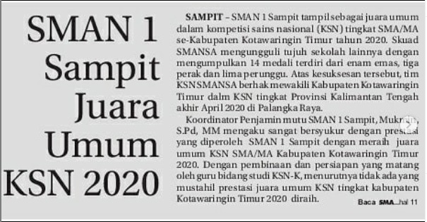 Alhamdulillah, berkat ikhtiar dan tawakal, siswa/i SMANSA lagi-lagi menorehkan prestasinya dibidang akademik, KSN (Kompetisi Sains Nasional) tk. Kabupaten Kotawaringin Timur.